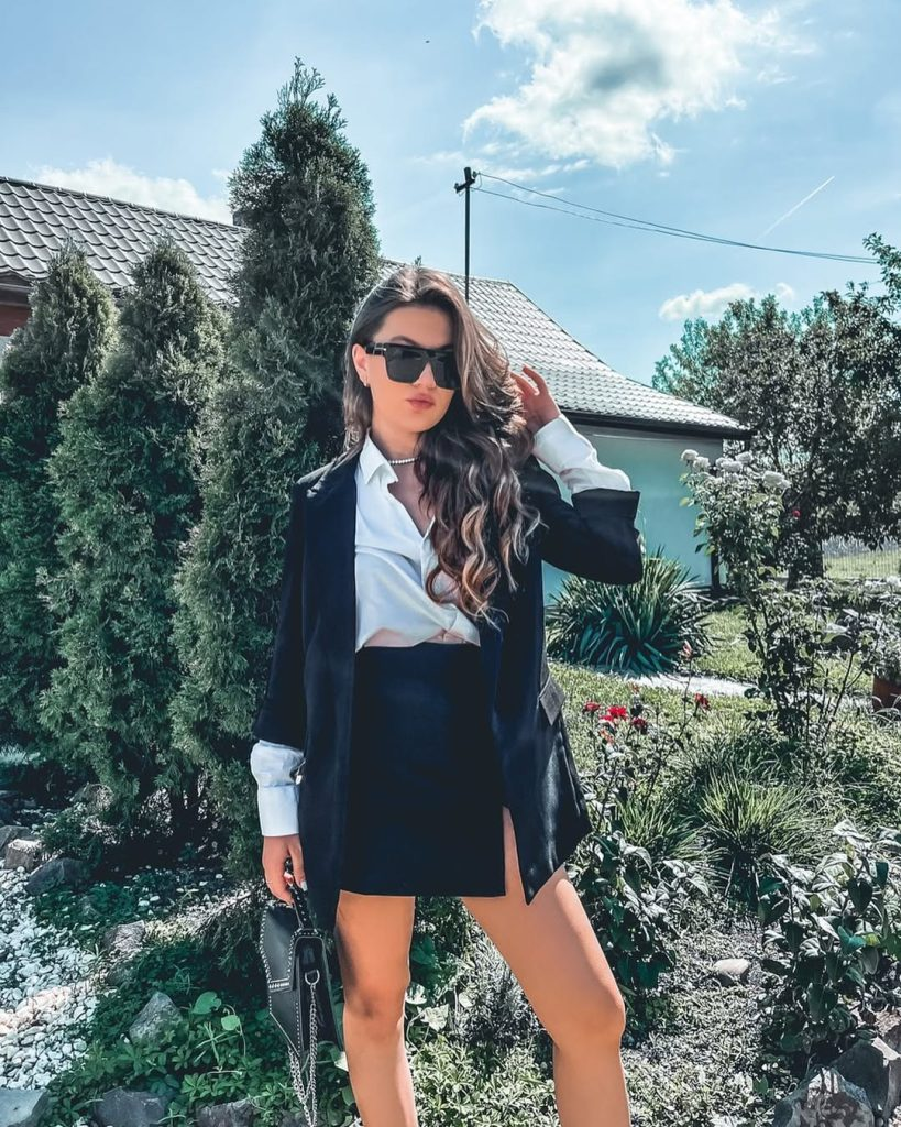 This outfit gives a clean and polished school look with a mix of classic and modern pieces. A crisp white button-down shirt is paired with a black mini skirt and an oversized black blazer. The fit feels neat but not tight, making it suitable for school settings where you want to look put together.
