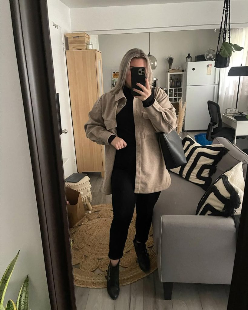 This look is made for cold classrooms and cooler days. A beige fleece overshirt is layered over a black turtleneck and black skinny jeans. The colors stay simple and calm, which gives the outfit a clean feel.