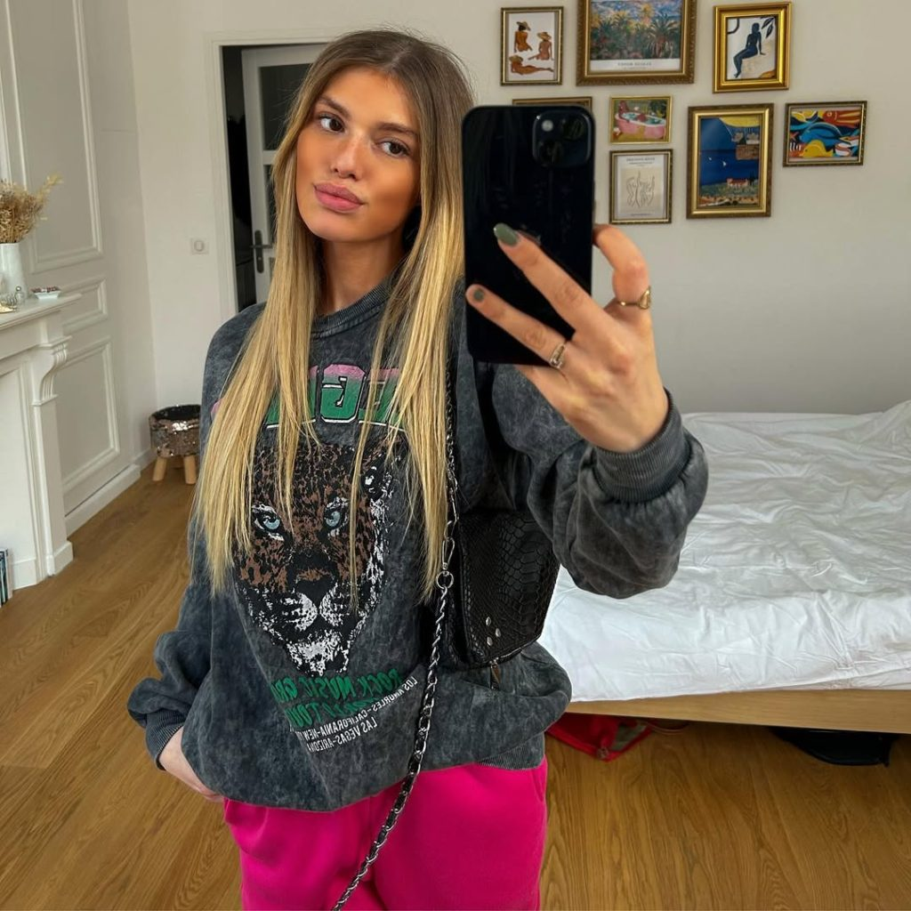 This outfit blends streetwear style with cozy comfort. A washed charcoal graphic sweatshirt is worn with hot pink joggers, creating a bold but relaxed look.