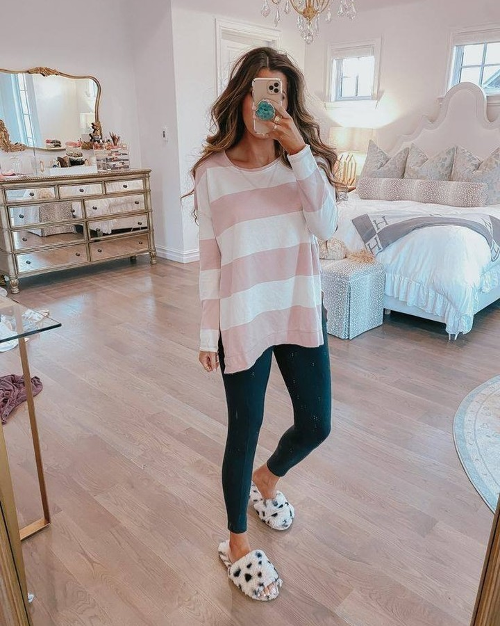 This outfit focuses on softness and ease. A blush and white striped oversized sweater is paired with black leggings for a relaxed feel.