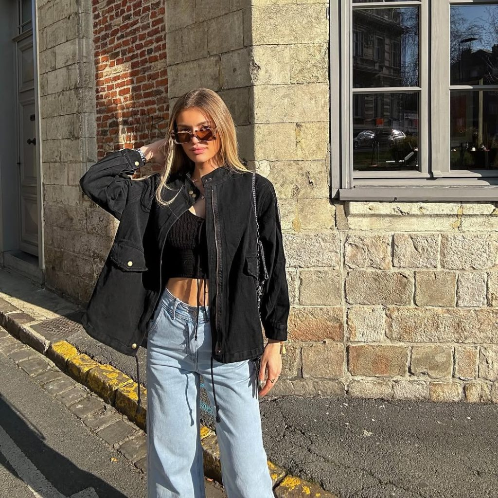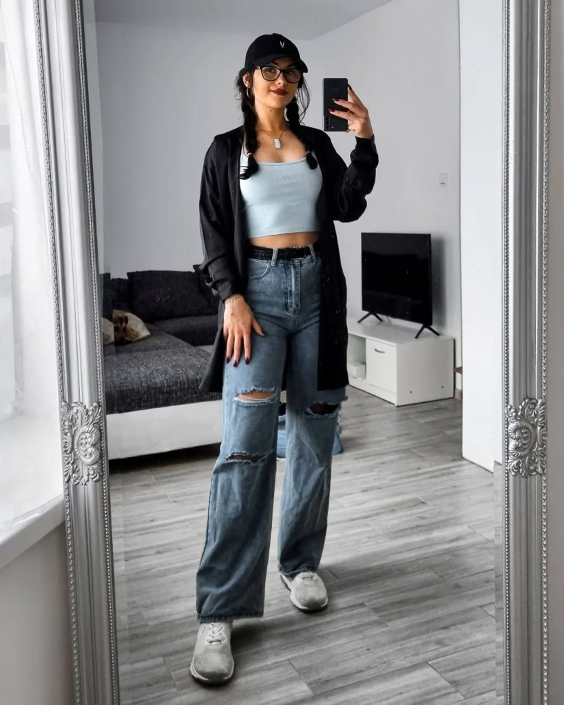 This look mixes sporty details with casual street style. A light blue ribbed crop top is layered with a long black overshirt and wide-leg ripped jeans.