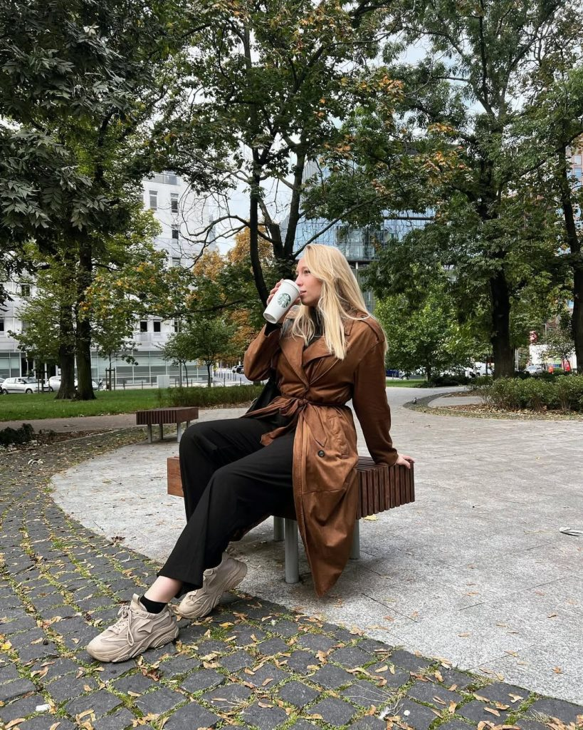 This outfit fits perfectly into fall weather. A brown belted trench coat is layered over a brown sweater and black straight-leg trousers.