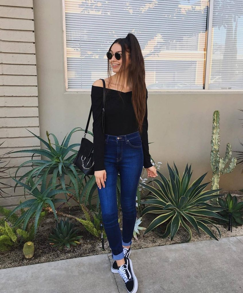 This outfit keeps things simple but stylish. A black off-shoulder long-sleeve top is worn with dark blue skinny jeans.