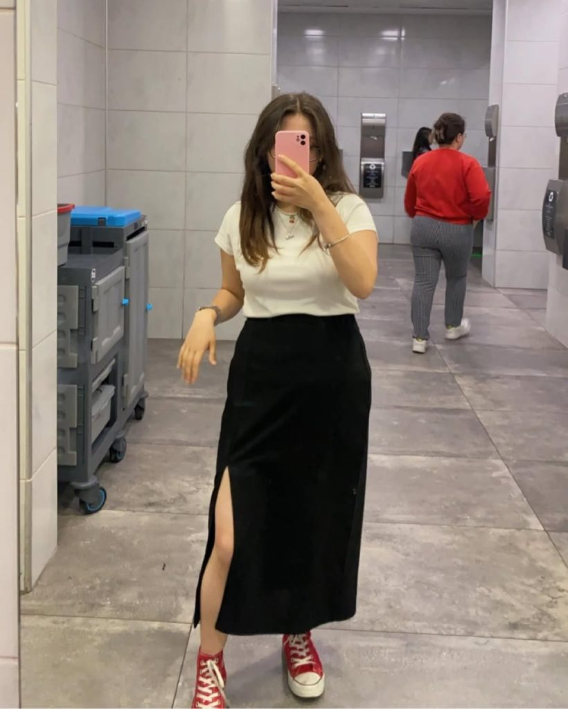 Clean Tee with Black Slit Skirt & Red Converse