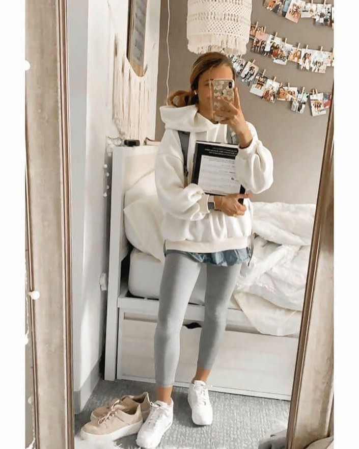This outfit is all about comfort. A white oversized hoodie is layered over a chambray shirt and paired with grey leggings.