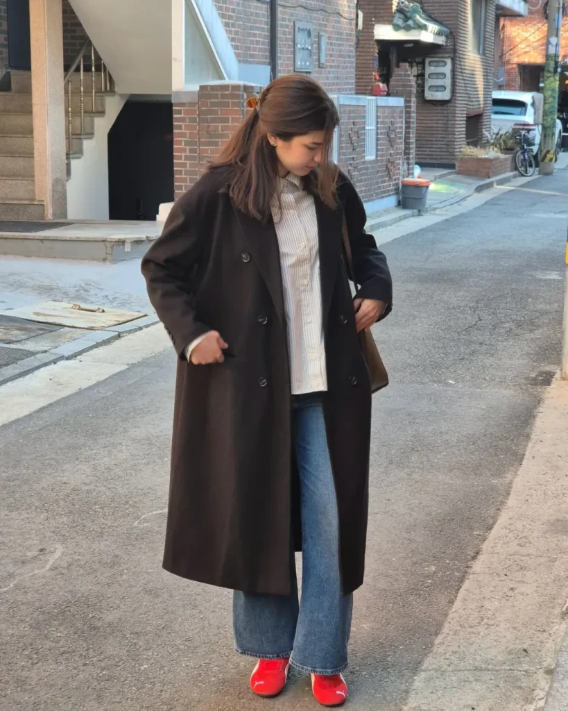 This outfit blends classic and casual elements. A dark wool long coat is worn over a striped button-up shirt and wide-leg jeans.