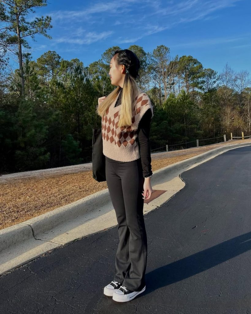 Argyle Sweater Vest with Black Flared Pants