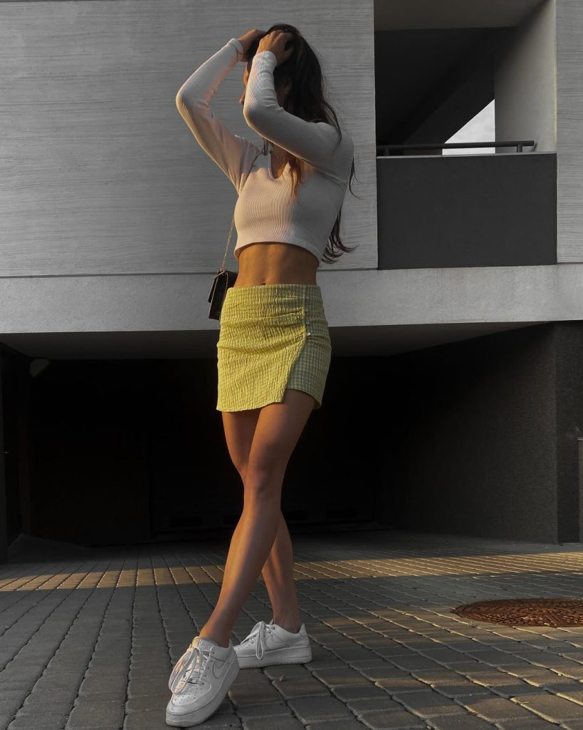 This warm-weather outfit feels light and cheerful. A white crop top is paired with a yellow textured mini skirt.
