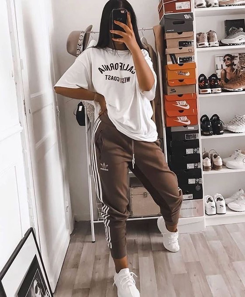 This outfit is sporty and relaxed. An oversized graphic tee is worn with Adidas joggers and white sneakers.
