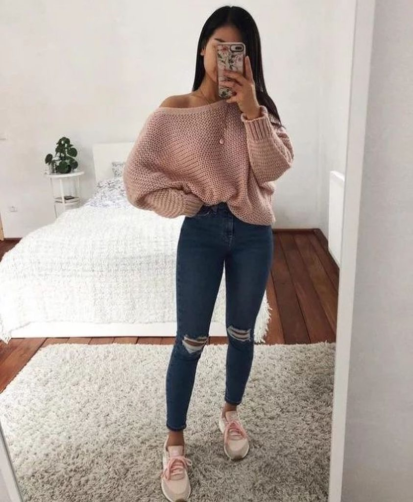 This outfit has a soft and cozy feel. A blush oversized knit sweater is paired with dark skinny jeans.
