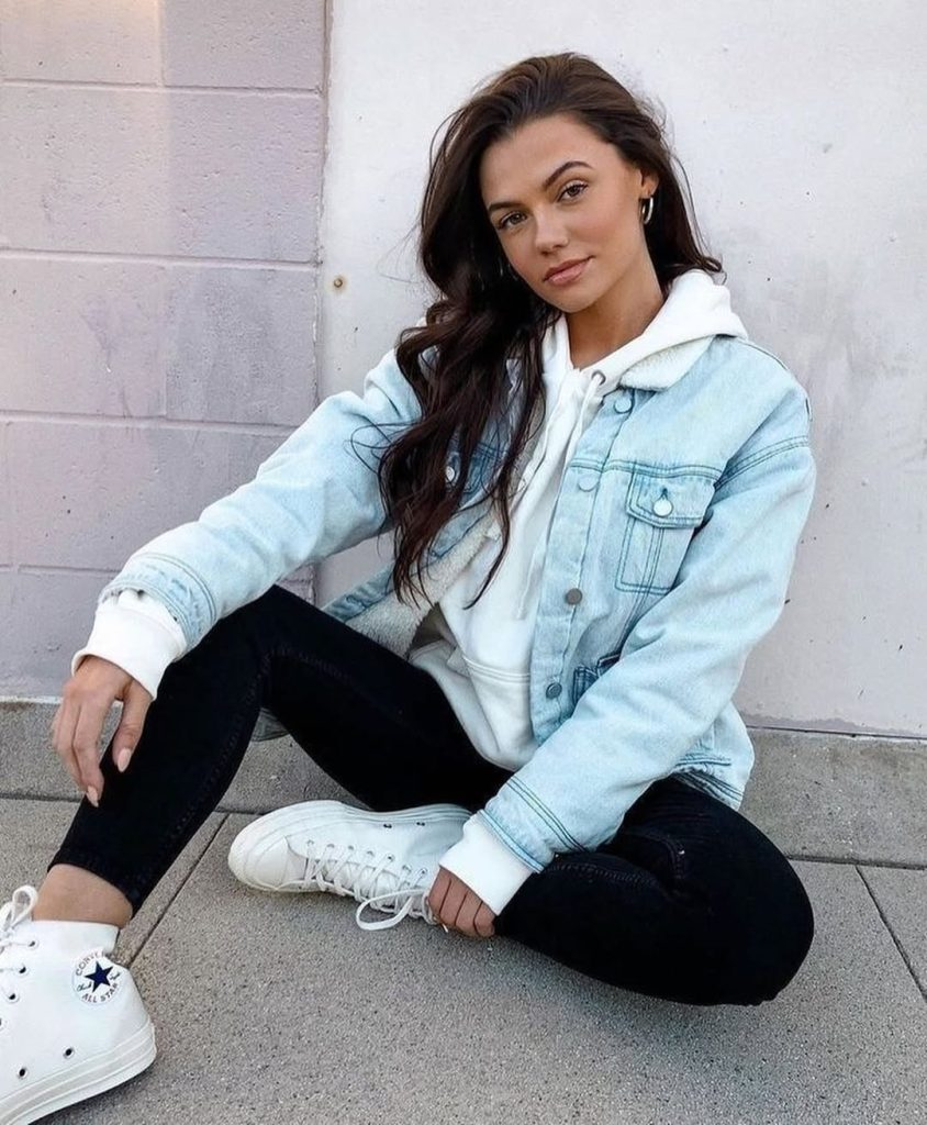 White Hoodie with Light Denim Jacket & Black Jeans