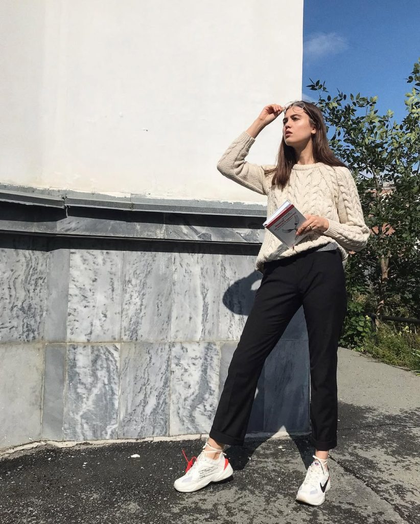 This outfit mixes warmth and structure. A beige cable-knit sweater is paired with cropped black trousers and white sneakers.