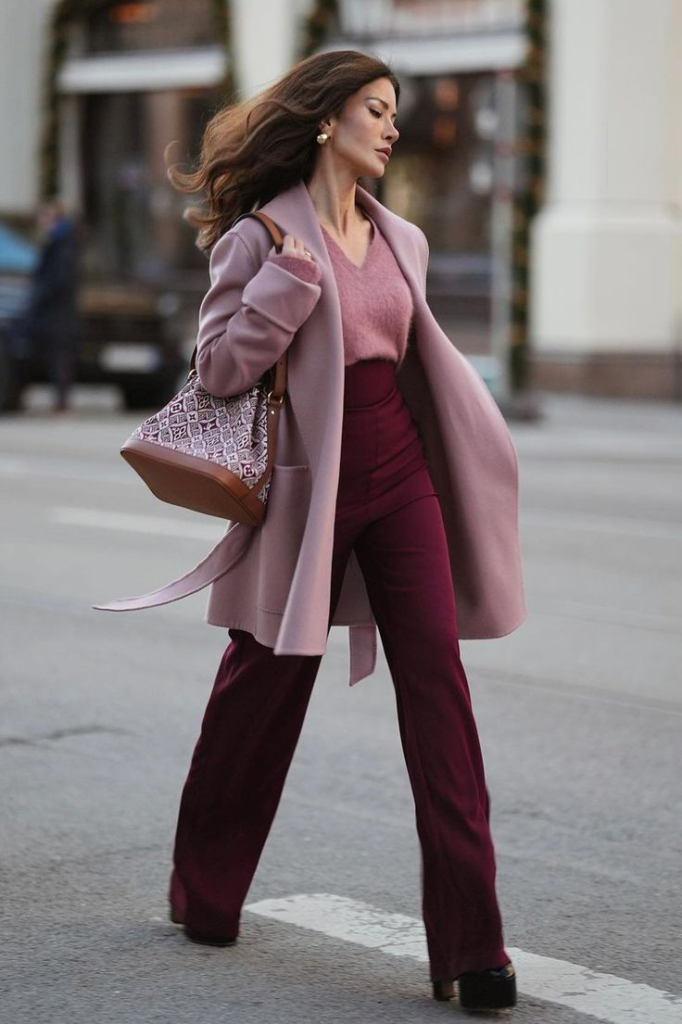 This outfit mixes soft and deep colors to create a romantic and stylish look. A blush pink coat rests gently over the shoulders, giving warmth and elegance. Underneath, a cozy blush sweater adds softness and comfort, making the outfit feel gentle and inviting.