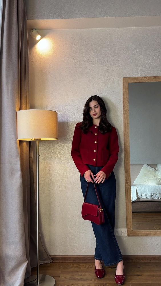 Paired with high-waisted dark blue jeans, the outfit feels balanced and wearable. The red quilted handbag and red loafers bring the look together with matching details. This style feels calm, polished, and suitable for a casual Valentine’s plan or a quiet dinner at home.