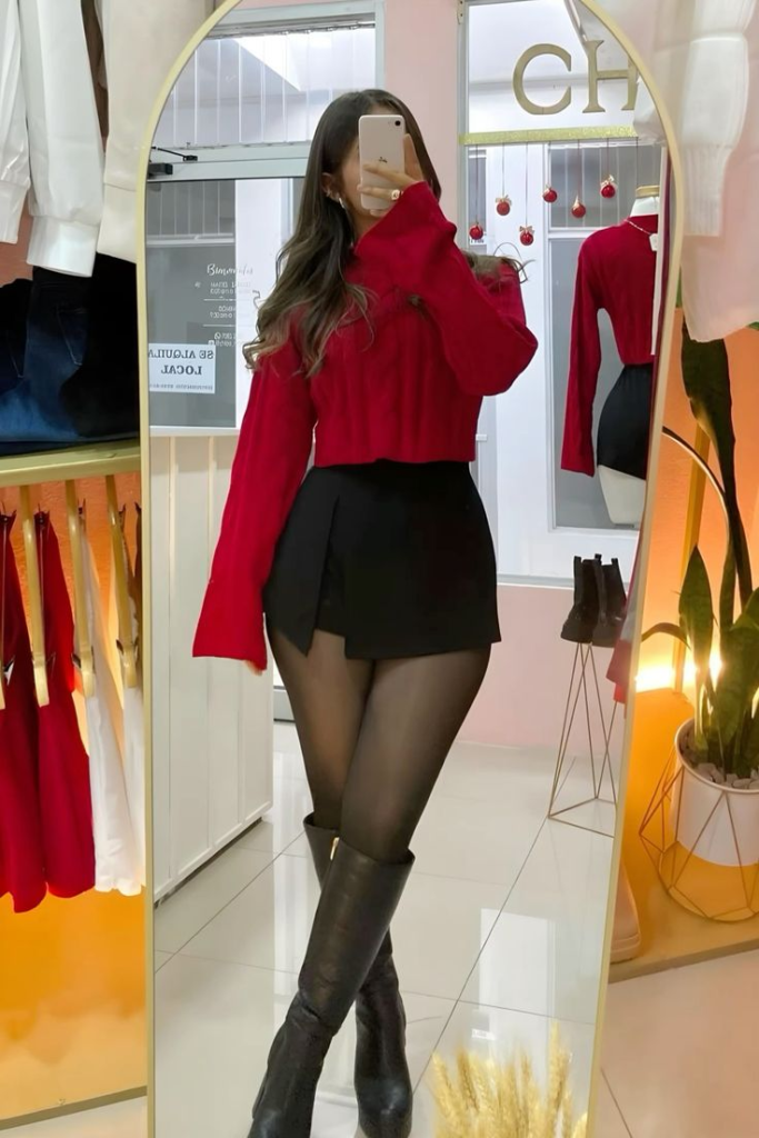 The black mini skirt adds contrast and a sleek touch. Sheer black tights connect the outfit smoothly, while knee-high black boots bring confidence and edge. Together, the pieces create a look that feels bold, romantic, and perfect for an evening celebration.