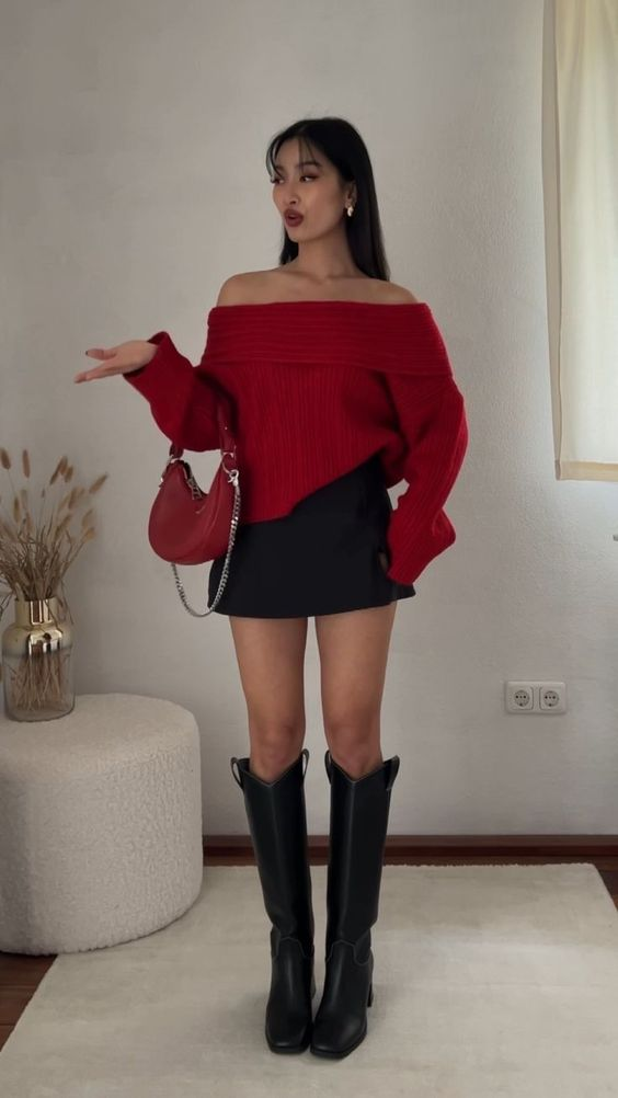This outfit brings together elegance and confidence. The off-shoulder red knit sweater highlights the neckline and adds warmth and charm. Its relaxed fit keeps the look comfortable and stylish.