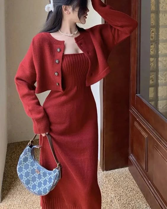 A cropped cardigan in the same red shade adds warmth and style. Metallic buttons bring small details that stand out. Accessories like a pearl necklace and a blue handbag add contrast and personality. This outfit feels romantic, warm, and timeless.