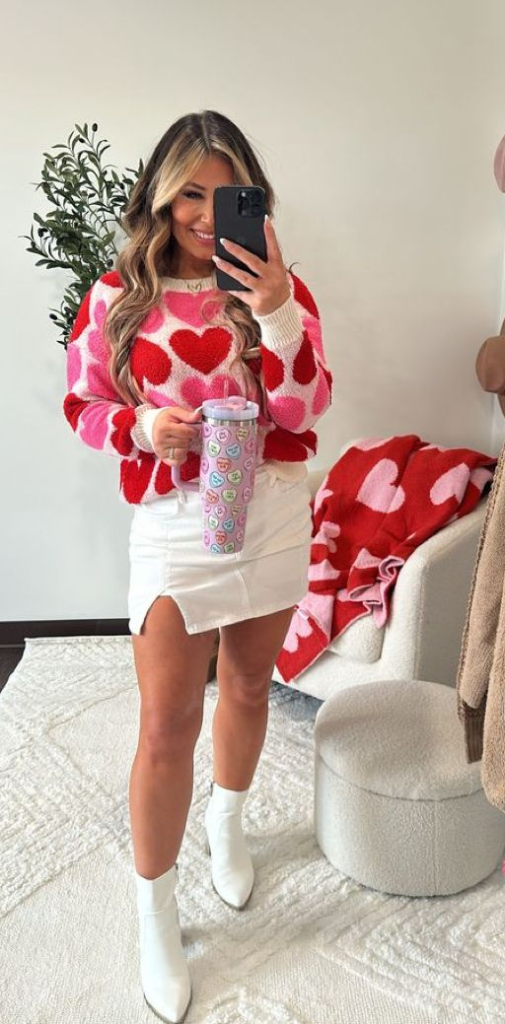 This outfit brings fun and joy to Valentine’s style. A knit sweater decorated with large red and pink hearts creates a cheerful and cozy feel. The playful design makes the outfit stand out.