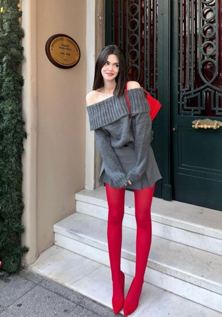Red tights and matching heels bring a strong Valentine touch. A small red bag completes the look. This style feels modern, cozy, and confident.