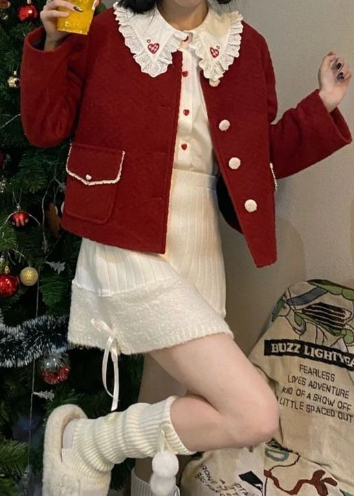 This outfit feels festive and warm. A red jacket with white buttons adds structure, while the white collar with heart details brings charm.