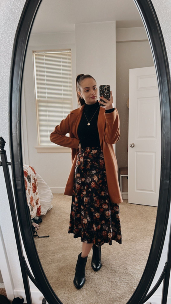 The floral midi skirt brings softness and style while keeping the length appropriate for school. Black ankle boots make the outfit practical for walking between classrooms.