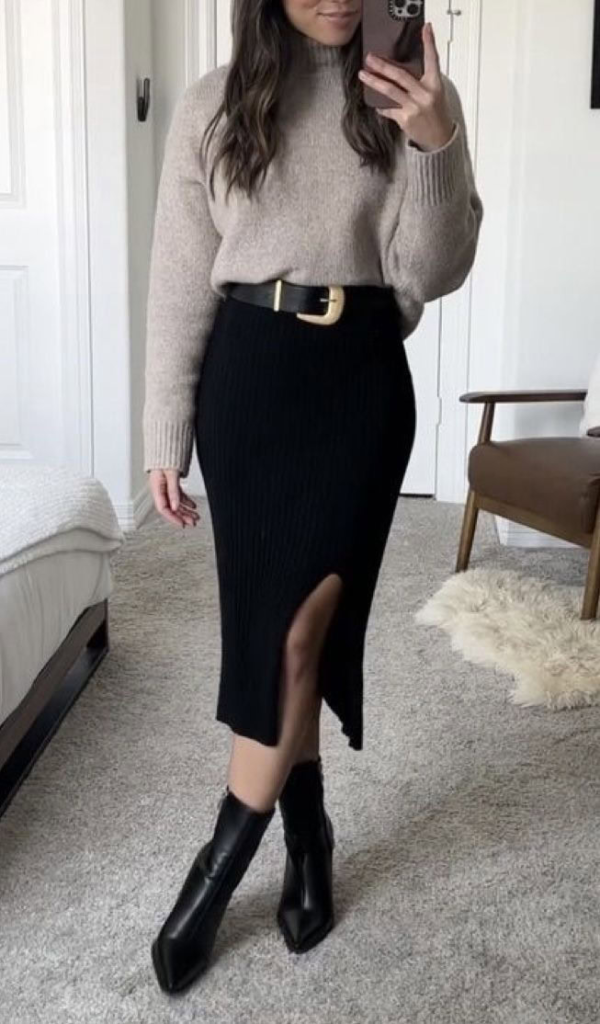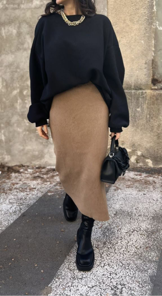 This two-tone outfit feels relaxed but still polished enough for the classroom. The oversized black sweatshirt gives a cozy feel, while the beige ribbed midi skirt adds structure and balance.
