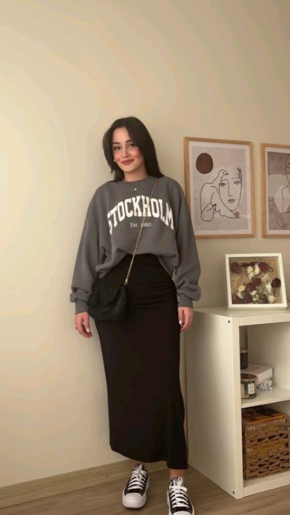 This outfit adds personality while staying classroom-appropriate. The oversized graphic sweatshirt feels relaxed and comfortable. The black midi skirt keeps the look polished and suitable for school.