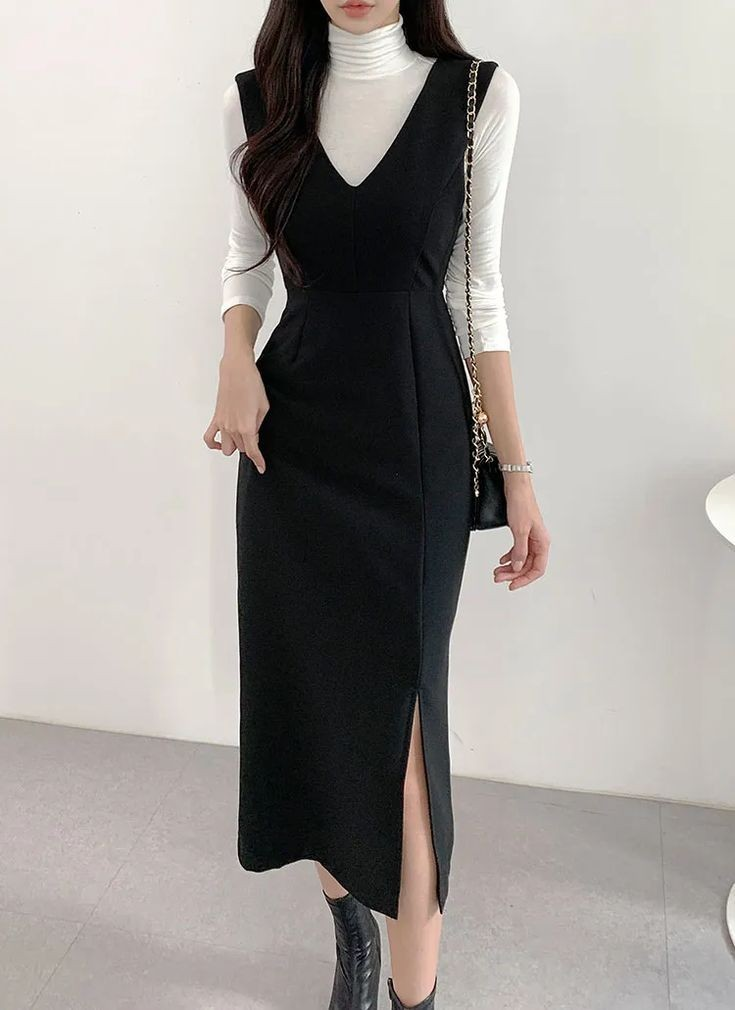 This layered outfit feels neat and structured for winter classrooms. The black sweater vest over a white turtleneck creates a sharp and tidy appearance.