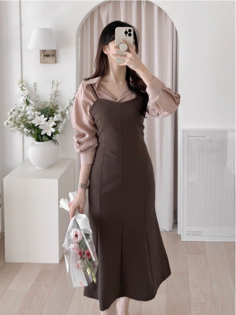 This outfit combines soft colors with a structured look. The chocolate midi dress creates a solid and professional base. The blush button-up shirt layered over it adds warmth and softness.