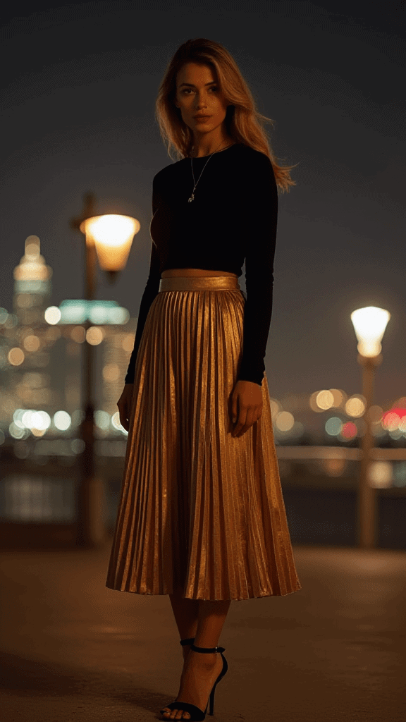 A metallic pleated skirt adds shine and movement to a winter outfit. The pleats help the skirt flow while walking, making it eye-catching.