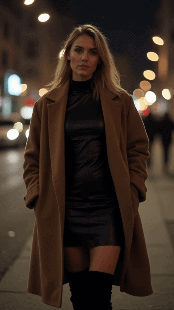 Adding a long coat keeps the outfit warm and adds drama. This look is best for nights when you want to stand out.
