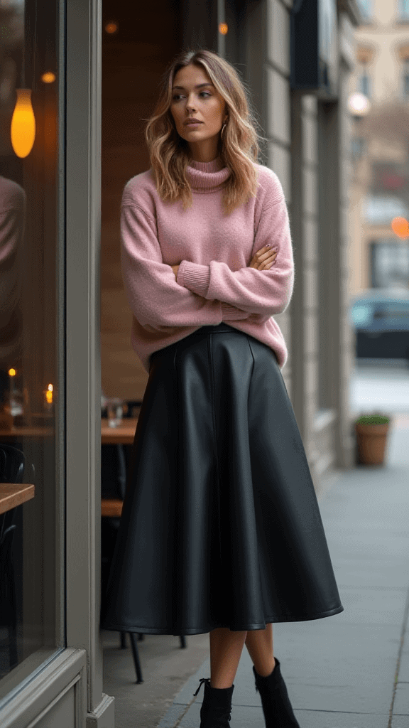 This outfit balances softness and edge. A leather midi skirt brings structure, while a cashmere sweater adds warmth and comfort.