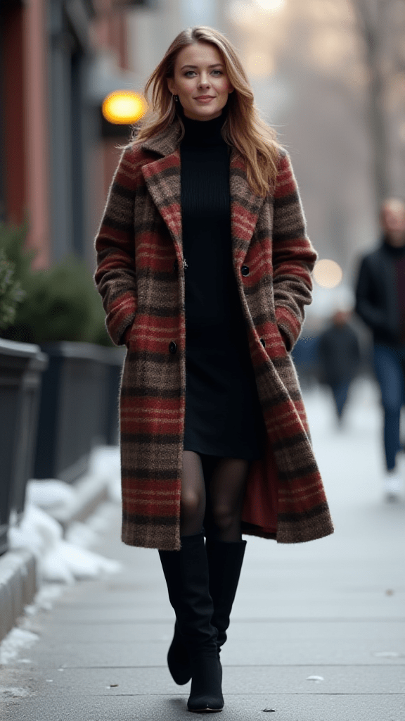 This look feels classic and polished. A plaid coat adds structure and style, while a turtleneck dress keeps the outfit clean and simple. Together, they create a strong winter outfit.