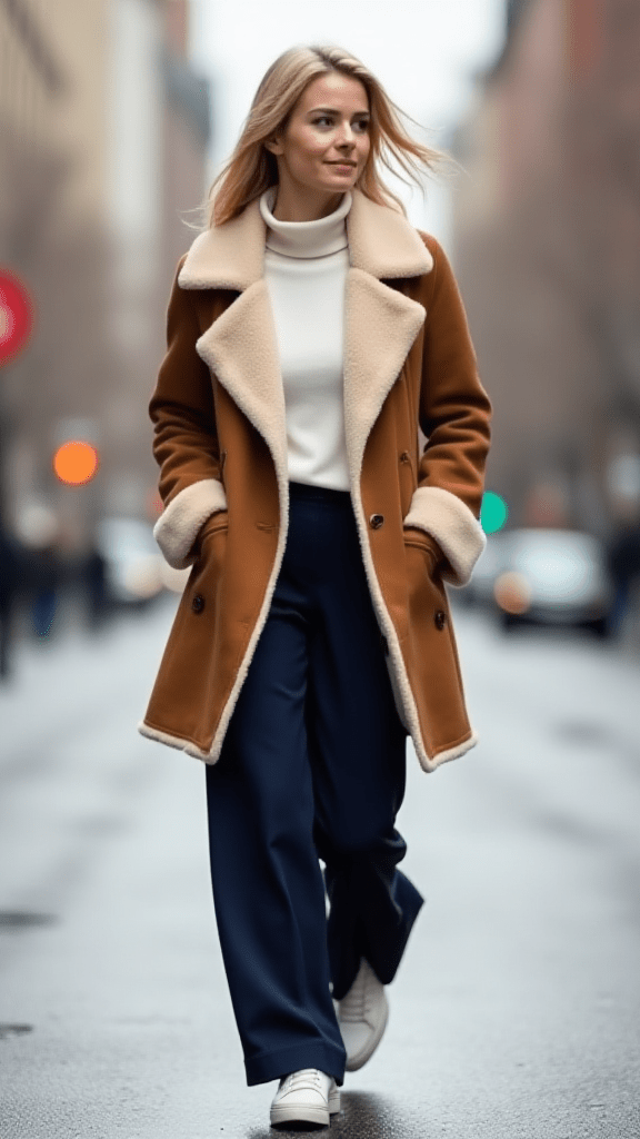 This outfit is all about comfort. A shearling jacket feels warm and soft, making it perfect for cold weather. Wide-leg pants add a relaxed and modern shape.