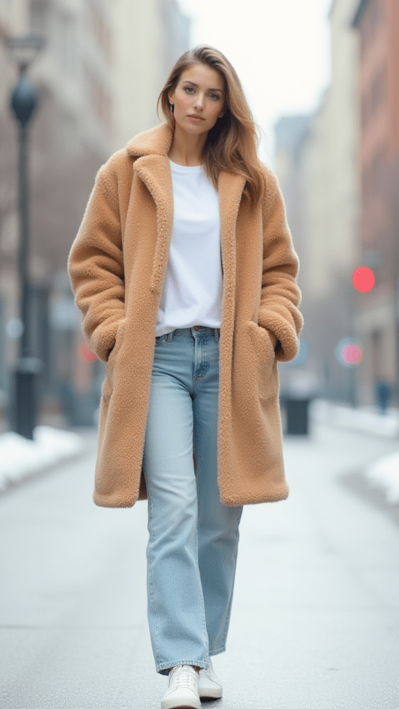 This outfit focuses on softness and ease. A teddy coat feels warm and comforting, while straight-leg jeans keep the outfit simple and classic.