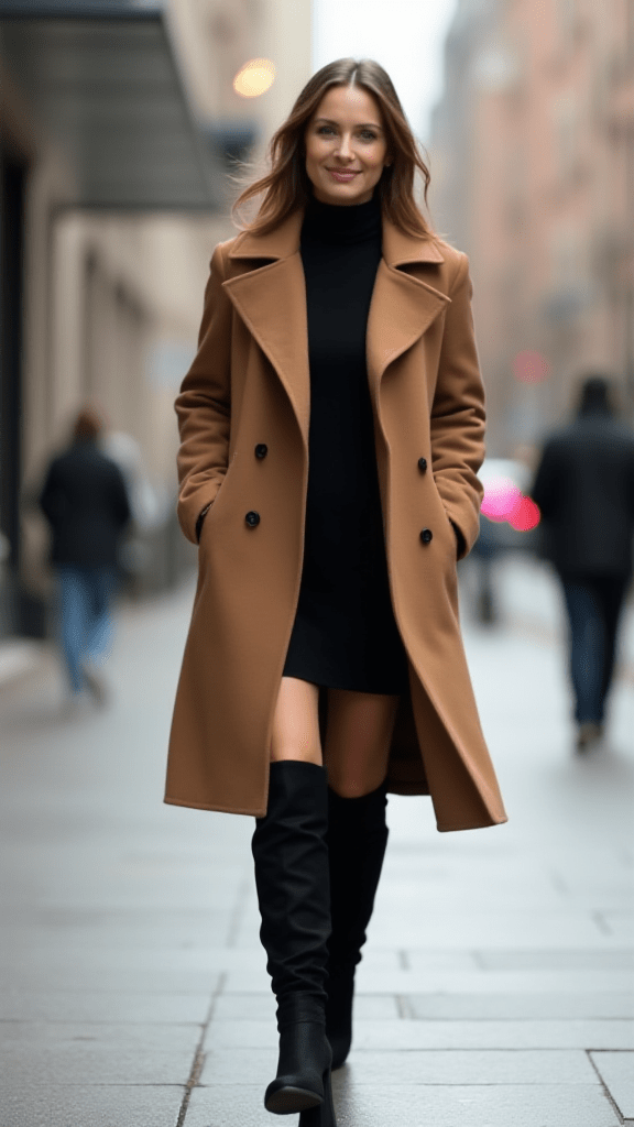 This outfit feels timeless and elegant. A wrap coat shapes the waist and adds structure. Knee-high boots bring warmth and a strong finish.