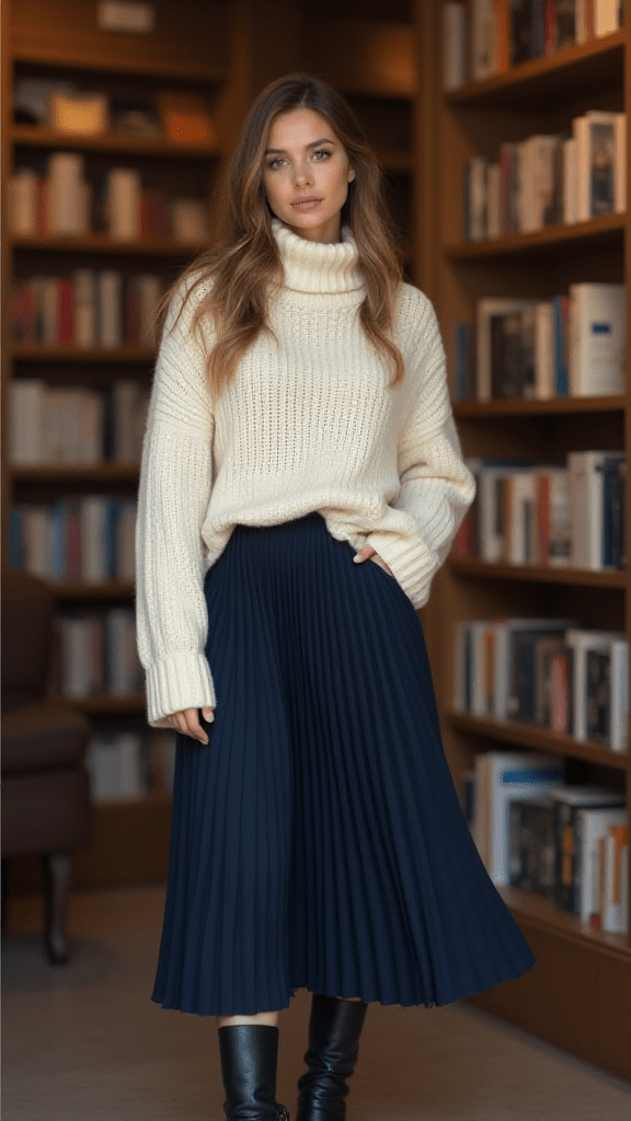 This outfit mixes cozy and refined elements. A chunky turtleneck keeps you warm, while a pleated midi skirt adds movement and softness.